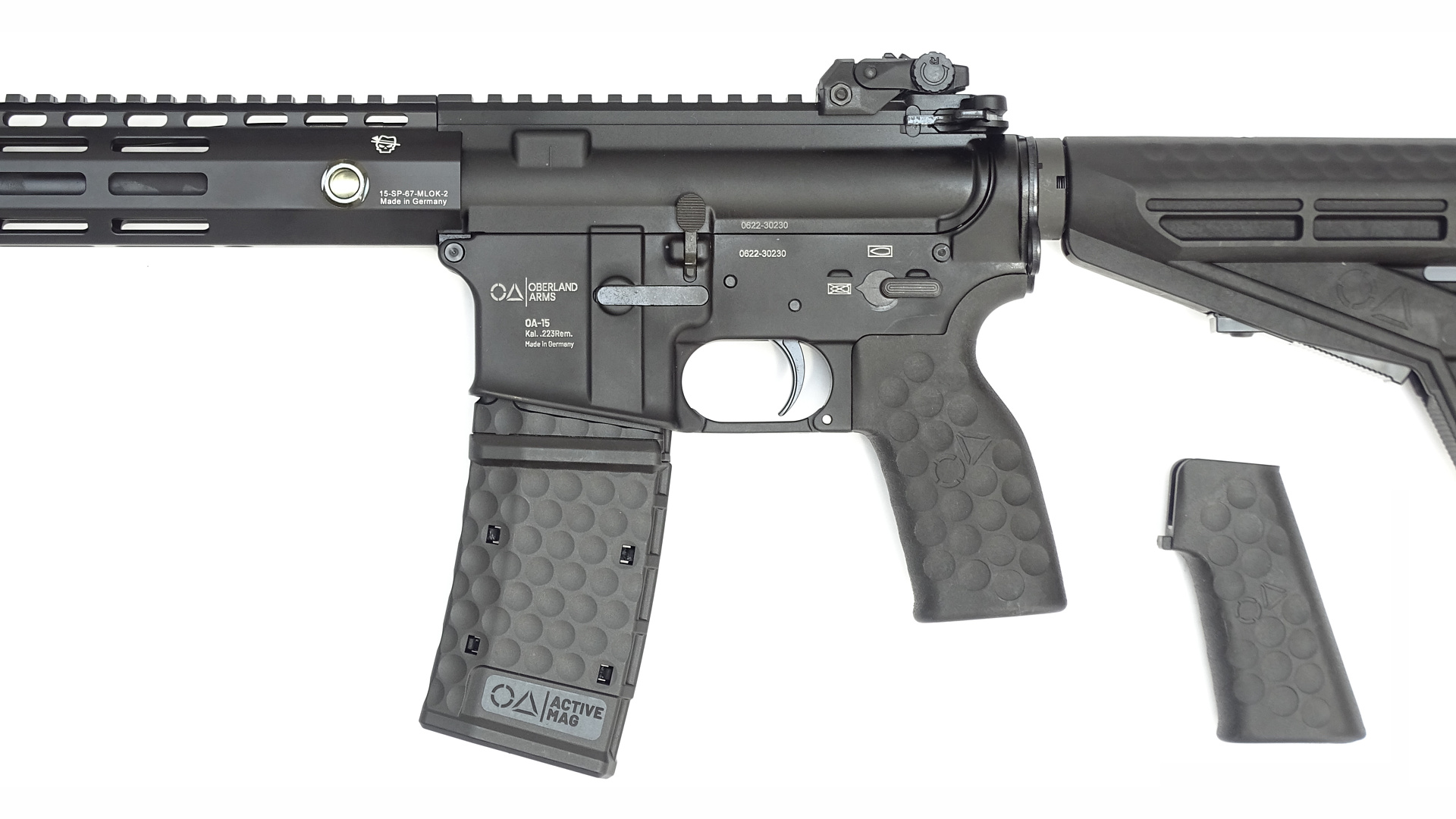 Der verstellbare OA M4-Schaft erlaubt eine Anpassung der Gesamtlänge zwischen 80 und 88 cm. Zum Lieferumfang gehören neben der klappbaren BUIS-Visierung auch der MFD Mündungsaufsatz, zwei ergonomische OA Griffe im charakteristischen Golfballdesign sowie ein OA Active Mag Magazin mit 10 Schuss Kapazität. Geliefert wird die Waffe im stabilen OA Transportkoffer mit Zahlenschloss.