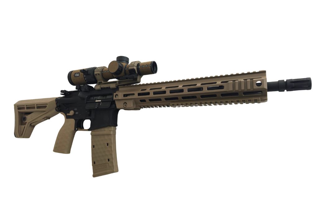 Komplett ausgestattetes AR-System von Oberland Arms im Kaliber .223 Remington mit 13" M-Lok-Handschutz, M4-Schaft und umfangreichem Zubehörpaket. Das Set enthält ein OA 1-8x24 LPVO Zielfernrohr, passende Montagen sowie vier 10-Schuss-Magazine.