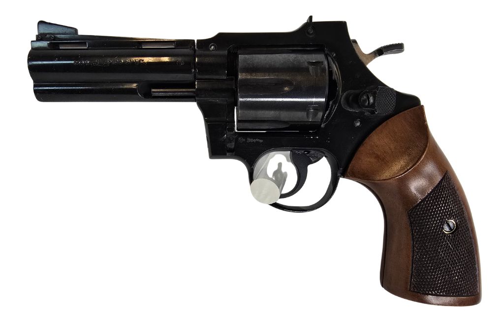 Gebrauchter Revolver im Kaliber .38 Special mit 4-Zoll-Lauf und Holzgriff. Klassische Stahlkonstruktion in traditioneller Revolver-Bauform, gefertigt in Westdeutschland.